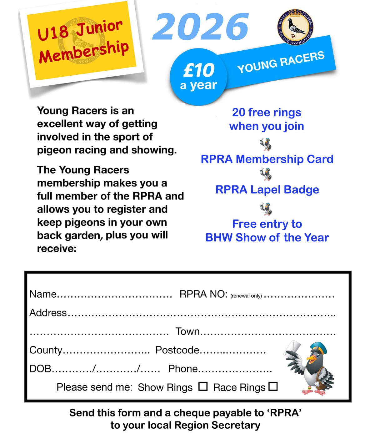 For just £10 a year you can become a Young Racer, which is our premium Junior Membership and is aimed at young people aged under 18 who have their own pigeons or who are looking to own their own pigeons in the future.
